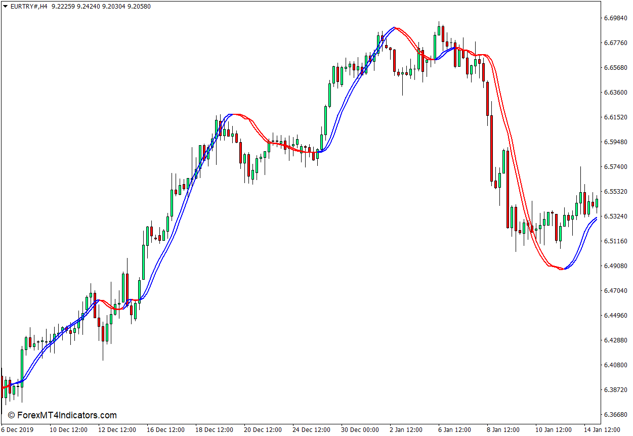 两条移动平均线的颜色发生变化以指示当前的趋势方向。 它绘制蓝线表示上升趋势,绘制红线表示下降趋势。